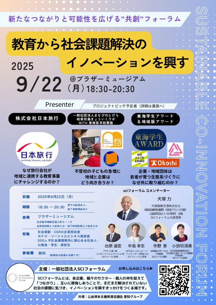この問題に対して、地域の企業・社会人と連携し、不登校児童・生徒向けの授業「まちなかスクール」も展開している。東海若手起業塾(協賛 ブラザー工業株式会社)の2025年度塾生としても選出。プロボノともに事業共創を行っている。